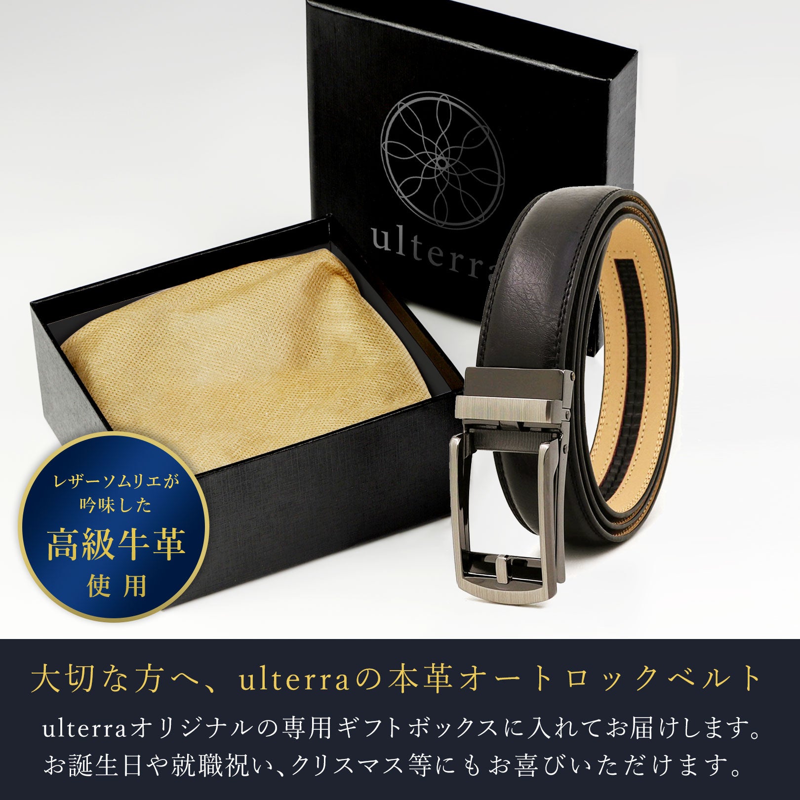 ulterra(ウルテラ)のオートロック本革ベルトには専用のギフトボックスが付属します。プレゼントやギフトなどの贈り物におすすめです!特に細目でスーツスタイルとの相性が抜群なので、高校生、大学生などの学生の方ももちろんですが、ビジネスマンやサラリーマンなどの社会人の方には特におすすめです。お父さんやご兄弟、お子様などの家族に向けて、また彼氏などの恋人や友達など、あらゆる大切な方におすすめのメンズベルトになります。お誕生日や父の日、クリスマスやバレンタイン、記念日や就職祝いなどのプレゼントにぜひご検討ください。