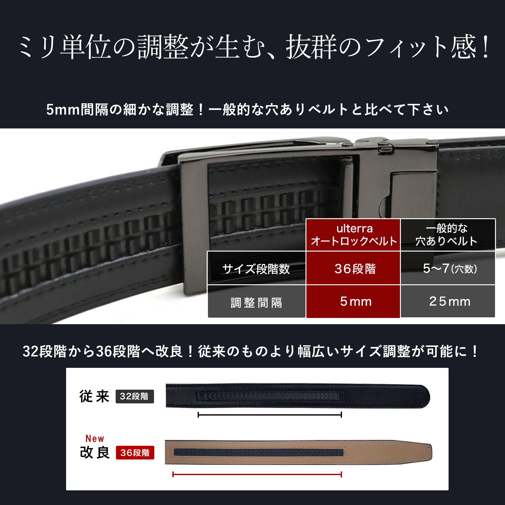 以前から好評だった5mm幅の細かいサイズ調整はもちろん、今回の本革ベルトでは以前の32段階調節から36段階調節にサイズ調整域を改良しました。