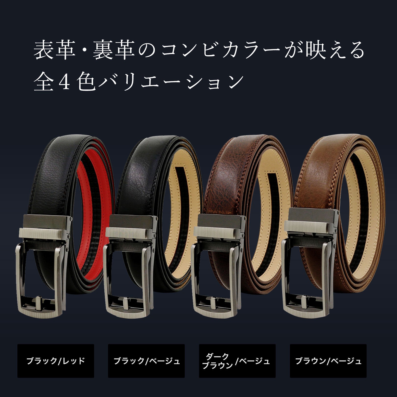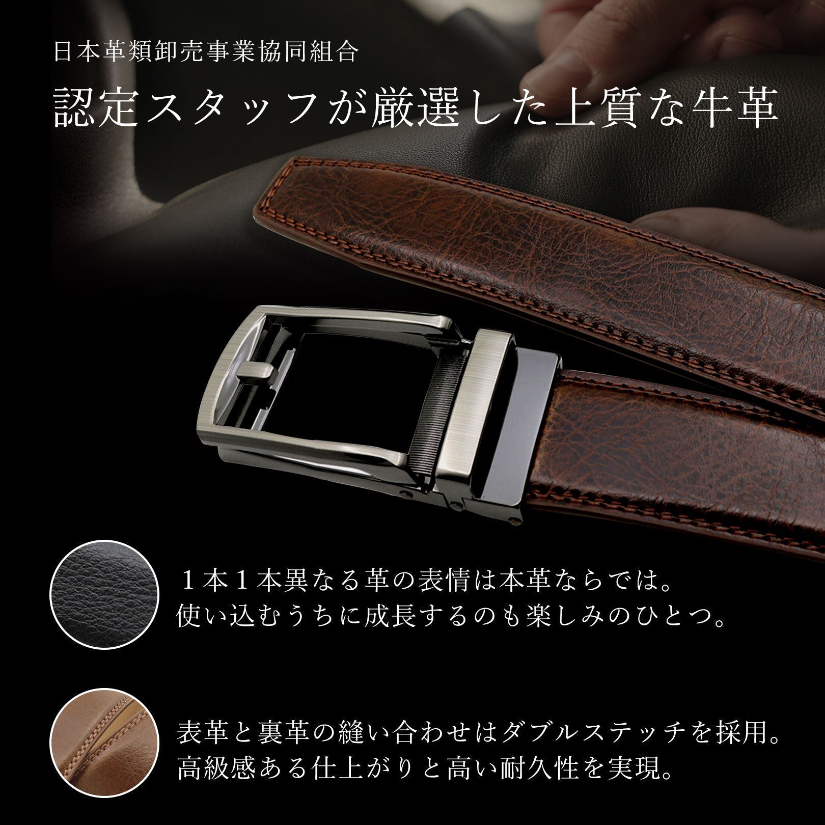 日本革類卸売事業協同組合認定のレザーソムリエ資格取得者がしっかり吟味した牛革を使用。今回のレザーは表革と裏革の色違いで見た目にも映えるオシャレなコンビカラーとなっています。 表革では1つ1つ異なる表情を持った天然皮革を使用。ベルトを使い込むごとに表情の変化や成長が見られます。裏側との縫い合わせには二重のステッチを使用し、高級感のある見た目と耐久性を実現させています。