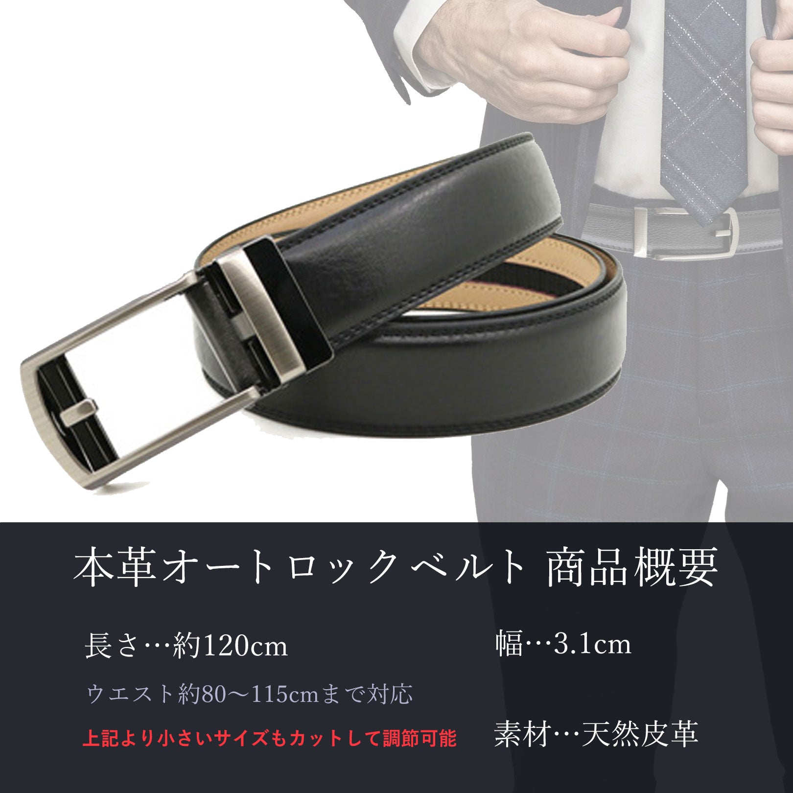 ベルト全長:120cm(ウエスト~110cmに最適) ベルト幅:3.1cm ベルト素材:本革(牛革)