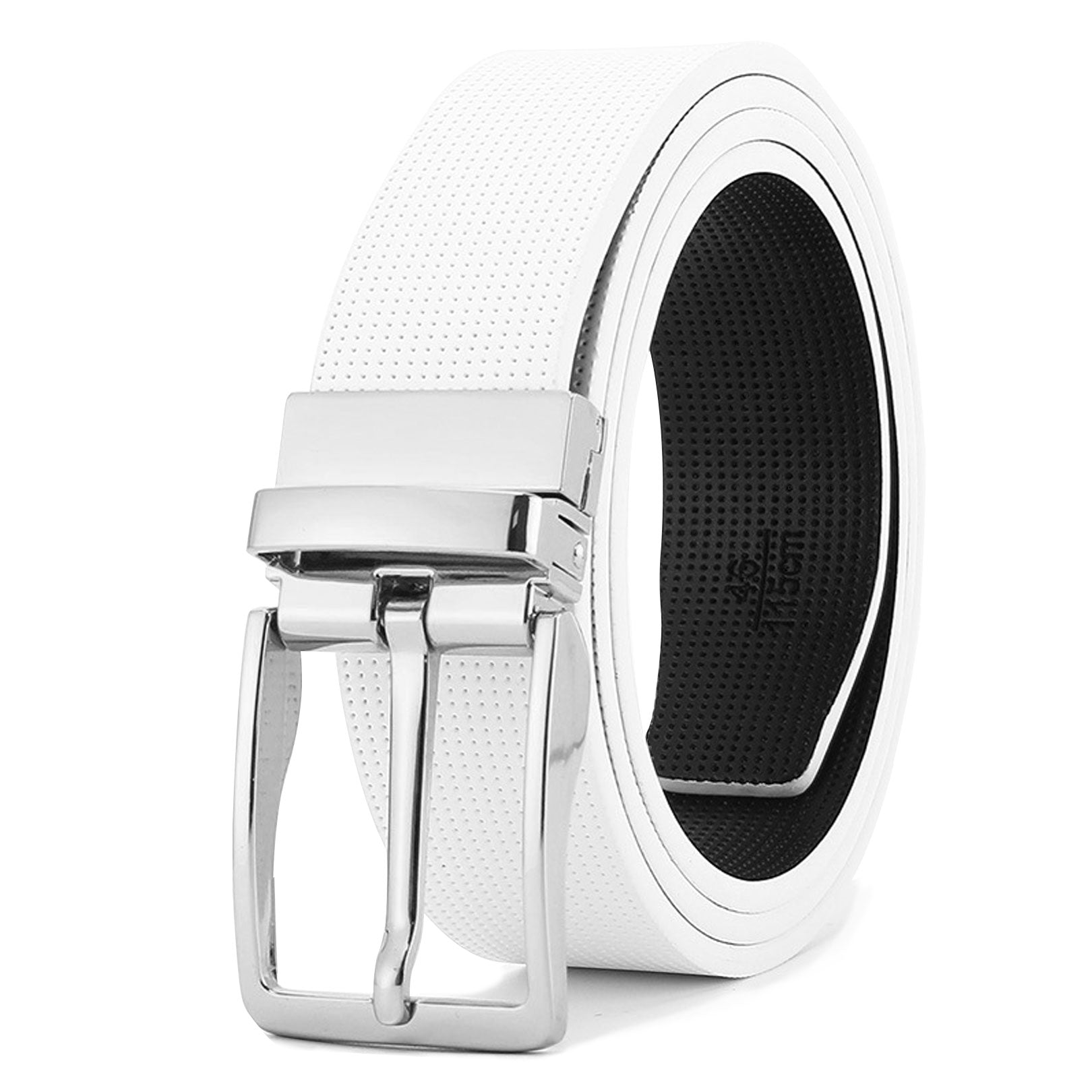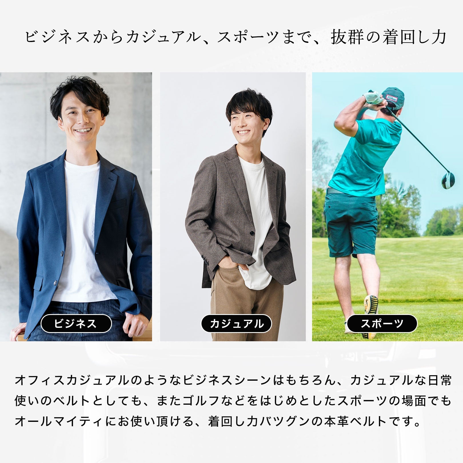 ビジネスからカジュアル、ゴルフなどのスポーツにもオールマイティに対応できる本革メンズベルトです。