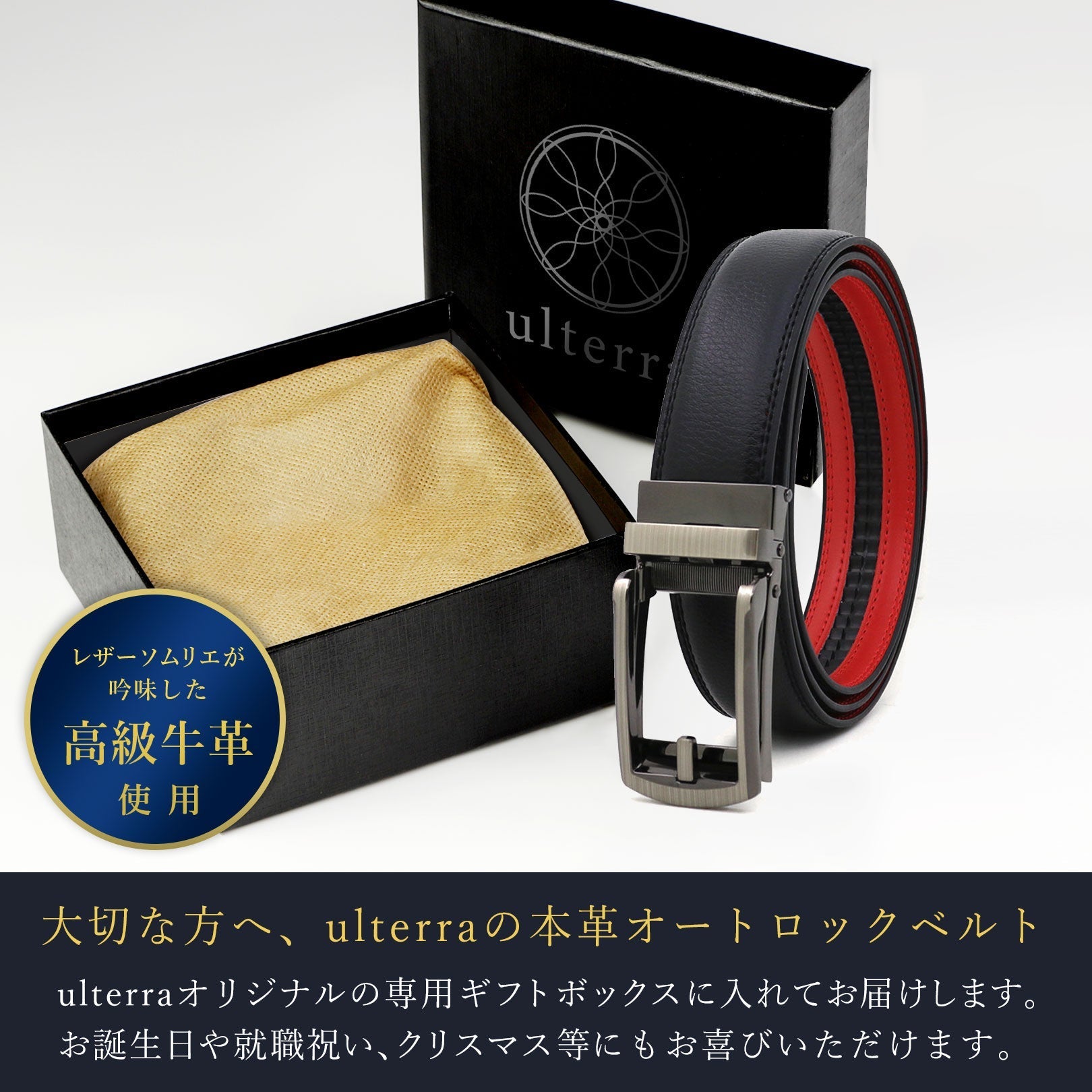 ulterra(ウルテラ)より本革オートロックベルトの登場です。このベルトはレザー専門資格であるレザーソムリエ認定のスタッフが厳選した本革を使用。 品格や上品さが重視されるビジネスの場においても信頼できる確かな高級感のあるメンズベルトになります。