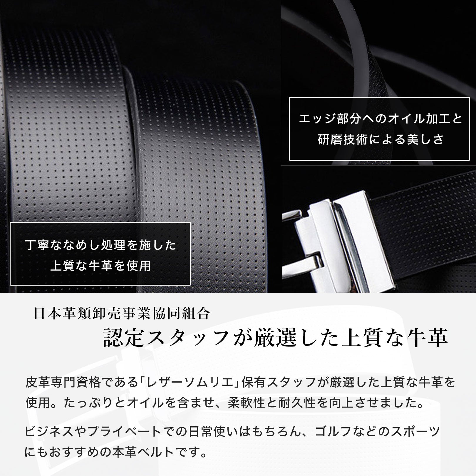 ビジネスからカジュアル、ゴルフなどのスポーツにもオールマイティに対応できる本革メンズベルトです。